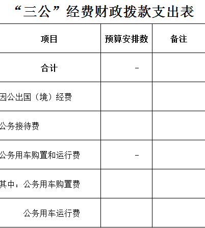 该表反映本单位因公出国(境)经费、公务接待费及公务用车购置和运行费预算安排数。