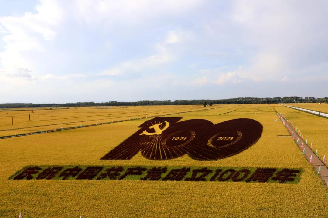 金秋时节,占地面积240万平方米的郊区生态农业科技示范园金浪滚滚,沉甸甸的稻穗随风起伏,田野上飘来阵阵稻香,黄澄澄的稻谷颗粒饱满,压弯了一株株粗壮的稻杆。站在15米高的观光塔上向下望去,数万亩稻田连绵成片,以庆祝“中国共产党成立100周年”和“中国粮食、中国饭碗”为主题的稻田画和麦田画交相辉映,呈现出一派丰收在望的喜人景象。