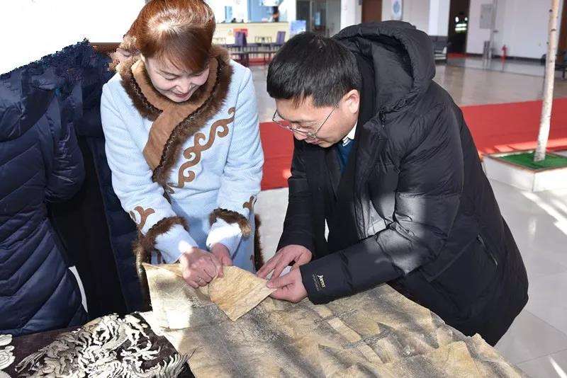 一行观看了原创歌舞表演《卧佛山的雪花飘起来》,随后欣赏了赫哲族伊玛堪传承人表演说唱《伊玛堪》,演出结束后,来到鱼皮画非遗保护展区观看现场展示和现场制作,省、市级代表性传承人尤忠美、解永亮、孙茂密、孙雪细致地讲解和示范鱼皮工艺画制作图纸剪裁、鱼皮剪裁、鱼皮粘贴、技艺法缝制以及成品缝制五大步骤。
