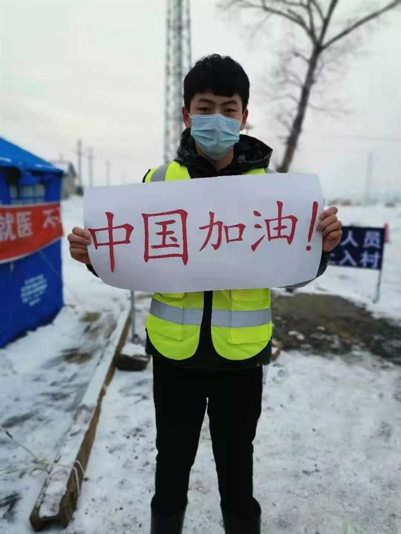 “00后”高中生王颢澎是佳木斯市第五中学的学生,这次寒假回到东格木村,他主动请缨加入志愿者服务队。每天从早到晚,王颢澎都在村口执勤检查,劝返来往车辆,为过往人员测量体温,其余时间还帮助村干部做了不少防疫宣传和外来户查访工作,他手举“中国加油!”的照片在村内微信群互相转发。“作为团员,站出来义不容辞,为防疫尽绵薄之力,这也是我送给自己最好的成人礼”王颢澎说。