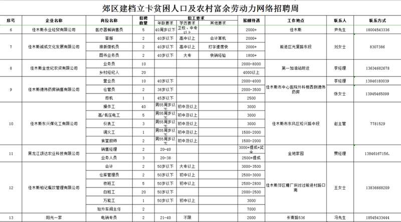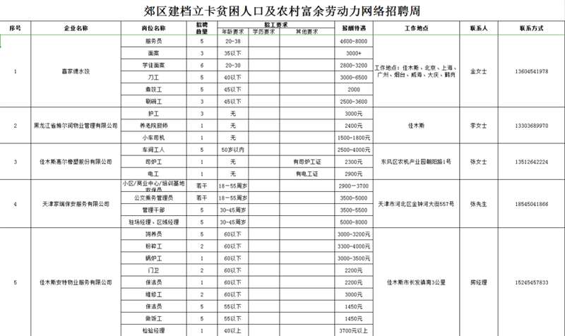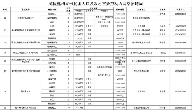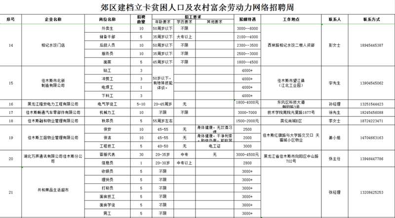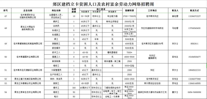 招 聘 对 象:以郊区建档立卡贫困人口及农村常住人口为主,同时欢迎佳木斯各城区及外县(市)有就业务工愿望的人员参加招聘。