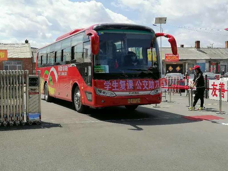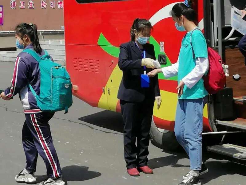 松北高中制定了严格明晰的返校要求及流程,由班主任提前下发至家长群和学生群,并且利用钉钉线上班会讲解落实。为确保学生返校途中安全,松北高中联系了佳木斯市公交公司,由公交公司提供两辆大巴车,沿途接运学生,直达校园,避免和外界人员接触。返校学生进入校园必须遵守规定流程(测温、扫码、消毒),然后按照规定的男女生通道进入宿舍楼和教学楼,避免交叉。