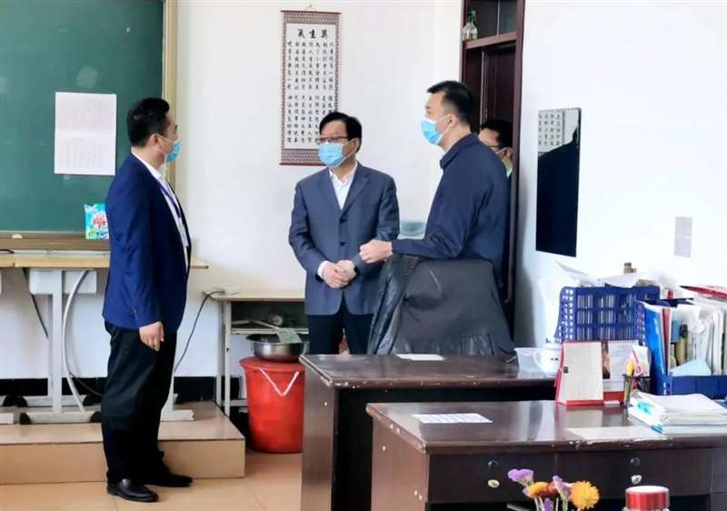 冯甲伟在校门口防疫检测点接受体温检测和登记,并主动扫健康码、配合消杀,随后到教学楼查看教学情况,深入食堂了解学生分散就餐和住宿情况,听取了校负责人关于学校疫情防控、学生复学、教学管理等情况汇报。