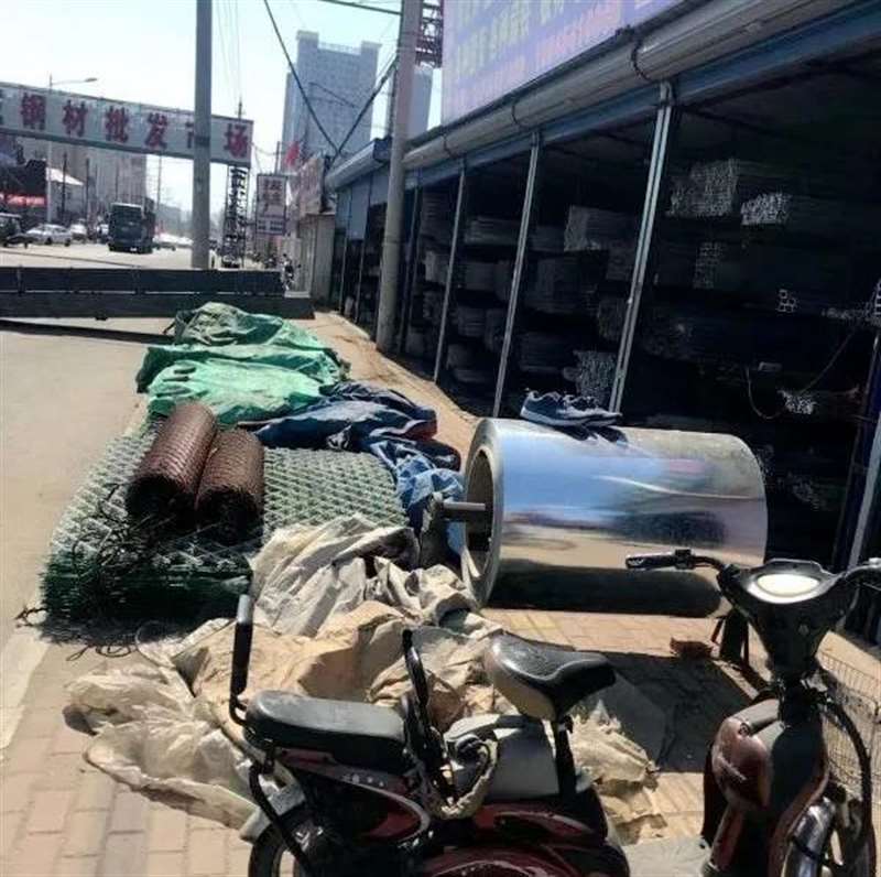 圃东街商铺、钢材市场钢材占道,极大影响了车辆、行人通行,社区对此问题多次走访入户、劝说,商户已主动清理各自占道物品。