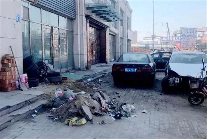 江南雅居北门商铺门口堆放7个吨桶、3辆违停僵尸车,社区下达通知单后,业主已自行清理完毕。