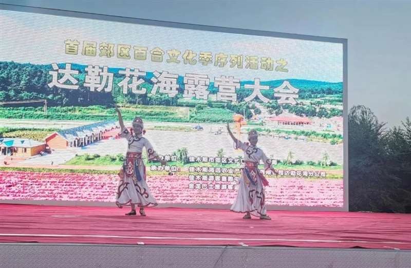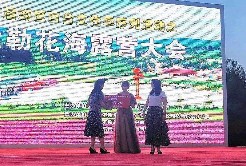傍晚18点30分,达勒花海人头攒动,主持人宣布露营大会开始,同时宣布直播大赛同步启动,伴着本届百合文化季主题原创歌曲《我在花海等你来》活动正式拉开帷幕,依玛堪说唱、《迎宾舞》等文艺节目的精彩呈现,使得广大游客在徜徉花海之后,悄然沉醉在晚会浓厚的节日氛围之中。活动中进行了短视频大赛颁奖典礼,抖音短视频《乘风破浪的小姐姐》获得了此次大赛的第一名。随后由郊区文体广电和旅游局工作人员自编自演的赫哲族萨满舞将活动推向了高潮。