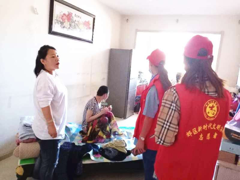 8月26日,巾帼志愿服务队7名志愿者到辖区贫困户罗某家中进行探望,罗某母亲与儿子均患有精神残疾,生活十分困难,志愿者为他们送去衣物等生活用品。同时还关切询问他们的生活现状,了解他们在生活中遇到的困难和问题,并鼓励他们要积极面对生活,战胜生活中的困难,并告诉他们如有什么困难可以及时寻求社区帮助,同时巾帼志愿服务队的志愿者们表示随时提供志愿服务。