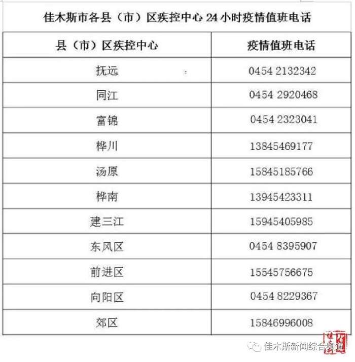 附:佳木斯市各县(市)区疾控中心24小时疫情值班电话。