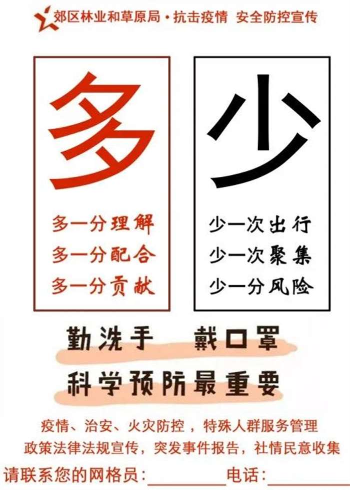 林业和草原局在五个国有林场的每户家门前都贴有一张宣传单,宣传单上有网格员的电话,有情况拨打打电话,网格员第一时间来解决。各林场通过微信、广告牌、广播等多种宣传方式,让每位居民了解在疫情面前如何保护好自己和家人的生命安全。