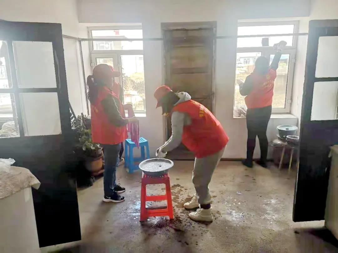 志愿者们身穿红马甲,擦桌子、抹玻璃、清理垃圾,发扬不怕脏、不怕苦、不怕累的奋斗奉献精神,大处着眼,小处着手,分工合作,默契配合。志愿者们还与贫困户亲切交谈,帮助贫困户解决生活中的实际困难。