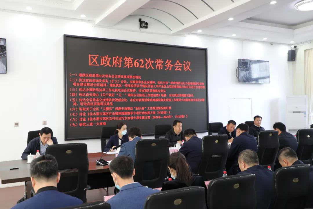 4月29日,区委副书记、区长徐永刚主持召开第62次政府常务会议,会议传达了省政府68次常务(扩大)会议、市政府常务会议精神,传达全市一季度经济运行分析暨招商引资和项目建设推进会议精神,分析一季度经济运行情况并就上半年全区主要经济指标目标任务进行安排部署;传达全国防汛抗旱工作电视电话会议精神,传达市安委办《关于做好“五一”期间安全防范工作的通知》精神,传达全省常态化疫情防控视频会议、市应对新型冠状病毒感染肺炎疫情工作领导小组指挥部全体会议精神,并就我区贯彻落实意见进行安排部署。会议听取了全区“大棚房”问题清理整治“回头看”工作推进情况的汇报,研究讨论《佳木斯市郊区打击毁林毁湿毁草专项行动实施方案》和《佳木斯市郊区农村生活污水治理专项实施方案(2021年—2025年)》,研究“三重一大”有关事项,通报区政府第61次常务会研究事项落实情况。