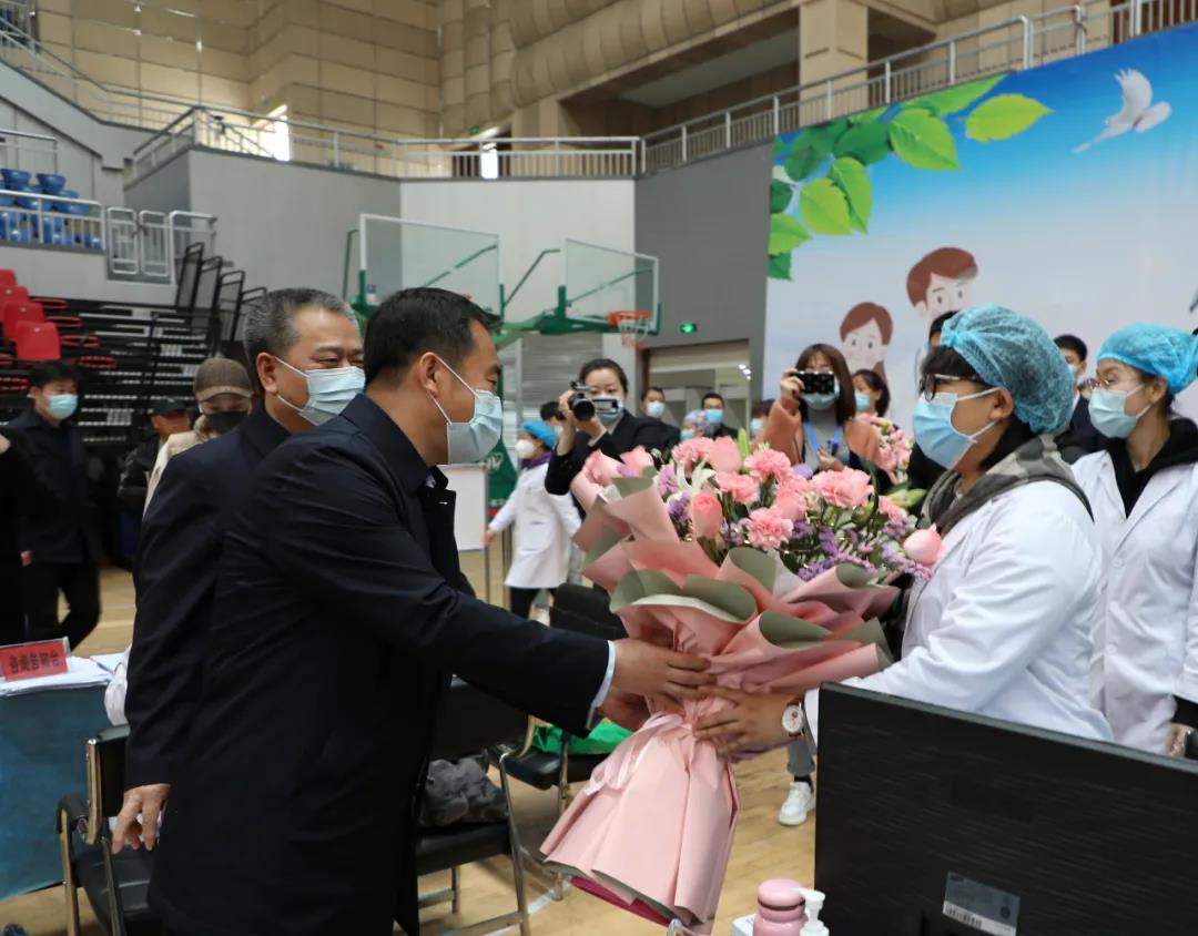 在会展中心接种现场,中国移动公司携带鲜花前来慰问坚守在一线的医护人员,为他们送上节日的祝福。中国移动公司在现场开展的诗朗诵感动人心,大家纷纷表示,慰问既是关怀,也是对未来的激励与期许,在今后的工作中将为广大患者提供更加全面优质高效的医疗护理服务,以实际行动献礼建党100周年。