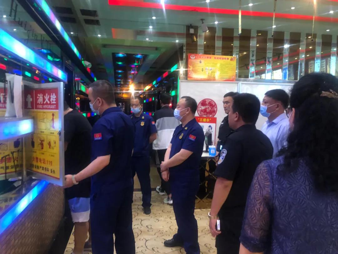 为进一步规范娱乐场所经营活动管理,保障辖区内娱乐场所安全生产秩序,严厉惩治娱乐场所存在安全隐患及无证经营等群众反映突出的问题,维护娱乐场所健康发展。6月29日,由区委常委、政府副区长宋鹏程带队,区应急局牵头,联合区文体广电和旅游局、区市场监督管理局、区卫健局、区消防大队、治安大队等部门组成的联合执法队伍采取“四不两直”(即不发通知、不打招呼、不听汇报、不用陪同接待、直奔基层、直插现场)方式对辖区内唱响时代KTV、金旺角KTV、银座KTV等多家娱乐场所进行联合突击检查。