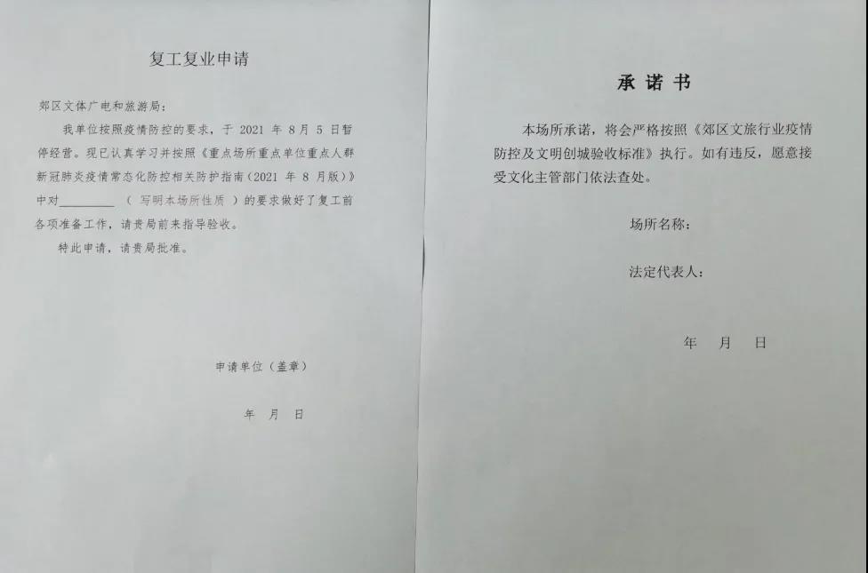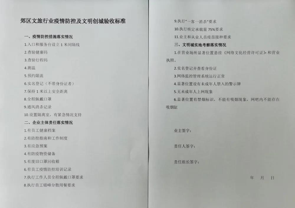 第一时间制定了《郊区文旅行业疫情防控及文明创城验收标准》《复工复产申请书》《承诺书》,并下发至文化娱乐场所业主群,要求各场所在具备3大项27条验收标情况下,方可提交《复工复产申请书》,经包保责任人及所在包保小组组长验收合格后有序开业,本着“申请一家,合格一家,验收一家”的原则,目前,全区共有29家文化体育场所提出验收申请,符合复工复产条件并验收合格的共计22家,验收合格的场所负责人签订了复工承诺书。验收检查将持续进行,文旅局全体机关干部随时待命,确保各场所有序恢复开放。