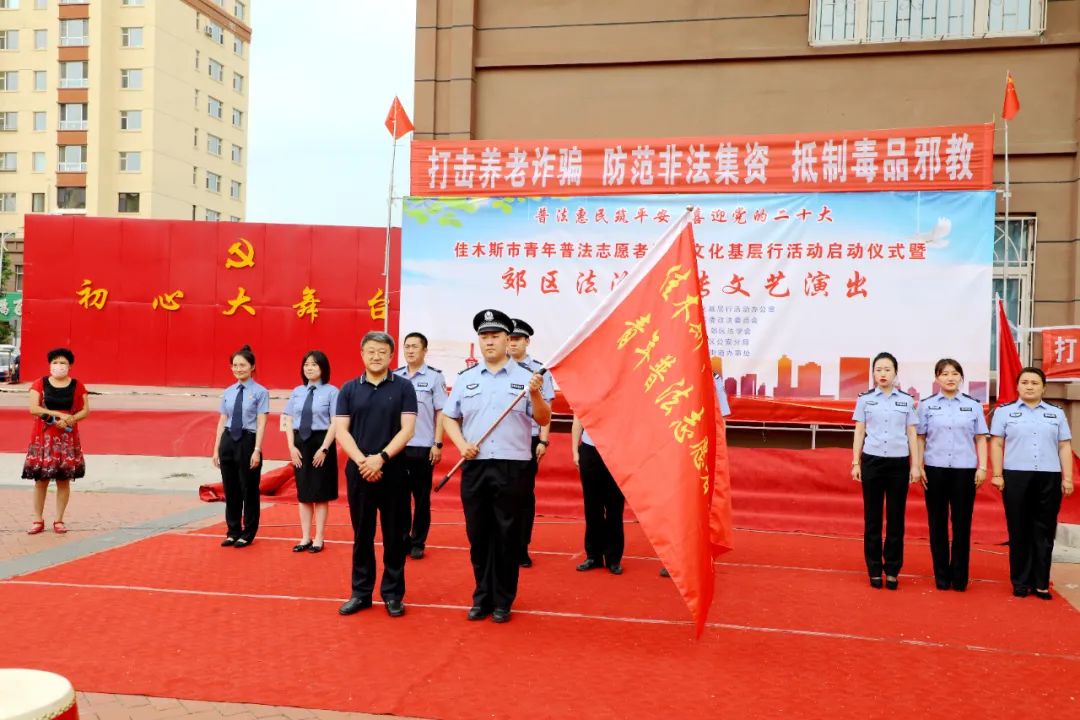 由佳木斯市法治文化基层行活动办公室、郊区委政法委主办,佳木斯市法学会、郊区法学会、郊区公安分局和友谊街道办事处共同承办的以“普法惠民筑平安 喜迎党的二十大”为主题的“佳木斯市青年普法志愿者法治文化基层行活动”于6月20日拉开帷幕,市委政法委常务副书记曲松涛宣布2022年“佳木斯市青年普法志愿者法治文化基层行活动”启动仪式开始,区委副书记、政法委书记卢国强全程参与青年普法志愿者法治文化基层行活动。来自区公安分局、区司法局、区市场监管局的10名青年志愿者代表,精神抖擞,齐声宣读普法志愿誓词,“我是普法志愿者,传播法治新理念。万语千言润民心,弘扬正义当模范。喜迎党的二十大,普法惠民筑平安!”誓言铮铮,铿锵有力,声音回荡在居民小区的广场上、楼宇间。