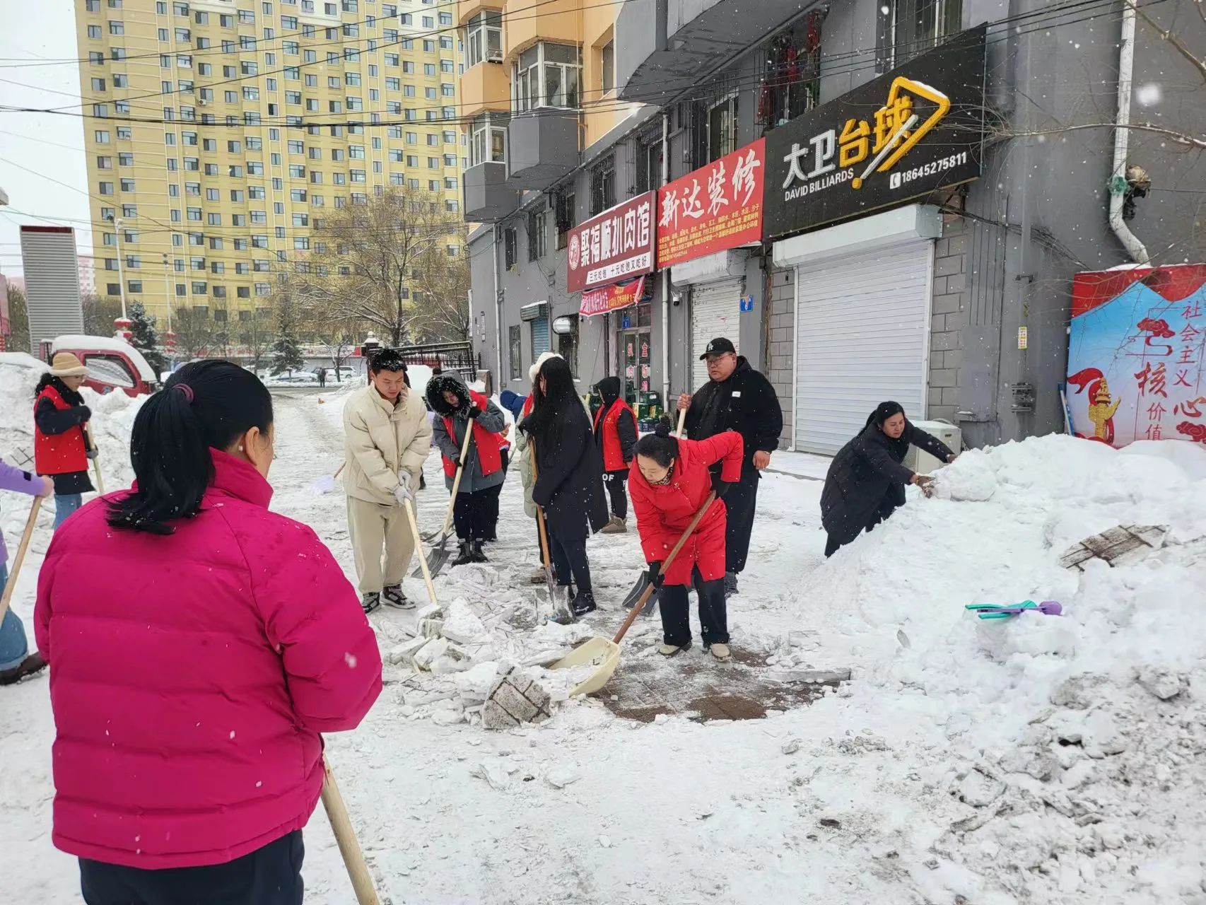 近日,区委政法委全体党员到冬梅社区开展清雪志愿服务活动,活动中党员志愿者克服路滑、雪下有冰、人行道上车多等不利因素,共同清理西林路临街门市积雪,为群众出行、私家车进出停靠提供了便利。