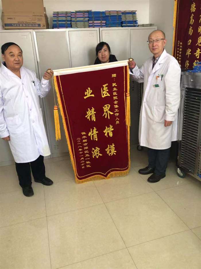 近日,五一社区工作人员来到佳木斯民生医院,把绣有“医界楷模,业精情浓”的锦旗送到医护人员手中。