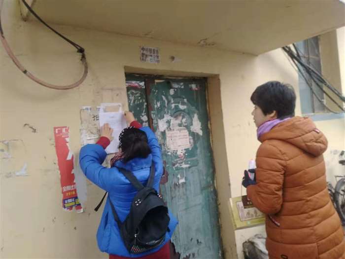 下午,红旗社区网格员分为A、B岗,入户走访排查并张贴通告,对弃管楼进行逐层排查,全力着手于警示督促工作。