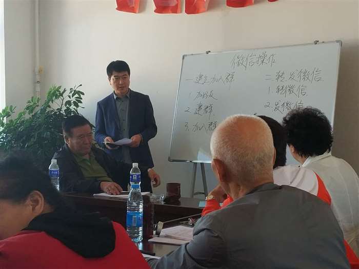 培训由区关工委的董泽华同志主讲。董老师在黑板上边讲边操作,从微信的最初级讲起,怎样建立、加入微信群,怎样转发微信、收看收听文件、语音以及文字的使用等相关内容。大家学得非常用心,认真记笔记,一步一步跟着老师操作,一遍一遍反复练习,加深记忆,全体学员都掌握了基本要领。培训结束后,老师还留了练习题和现场考试,测试学过的添加好友、转发微信、用微信下发会议通知等内容。通过本次培训,老同志们都学会了发、转、收微信及建立微信群、添加新朋友等基本步骤,此举极大方便了关工工作。