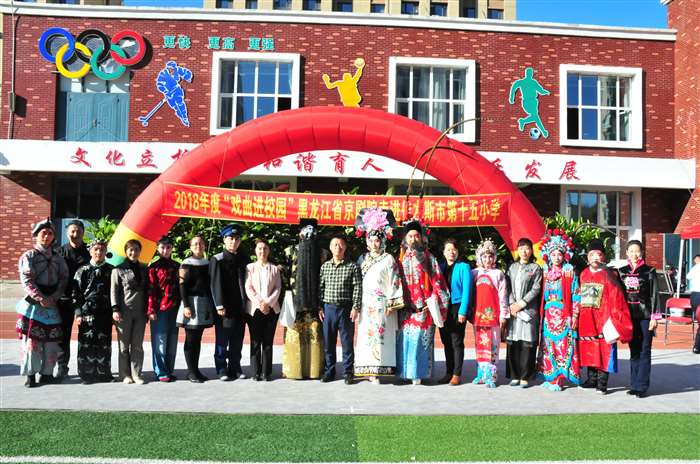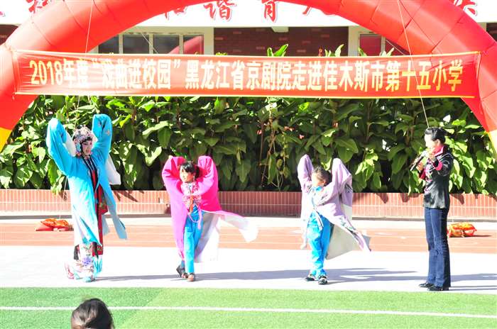 近日,第十五小学校园里紧锣密鼓,热闹非凡。为落实国务院京剧进课堂的要求,2018年度“戏曲进校园”黑龙江省京剧院走进郊区第十五小学进行公益演出。全区各学校音乐教师和第十五小学全体师生观看了此次演出。 此次公演的节目有京胡独奏,传统京剧《三岔口》、《拾玉镯》、《红灯记》、《四郎探母》、《铡美案》等片段。演员们的服饰、扮相、舞台功夫令在场的学生们耳目一新,激发了他们的观看热情。为了让学生们对国粹京剧有比较深入的了解,主持人现场对京剧的起源、特点、行当、写意性表演技巧等进行了深入浅出的讲解并配合相应的表演,这使学生对京剧产生了浓厚的兴趣。学生上台与演员互动,表演刀花,水袖,亲身体验京剧表演的独特魅力。 演员们精彩的台上表演,字正腔圆的唱功,青衣花旦的形体造型艺术更是赢得了师生们一浪高过一浪的掌声! 京剧作为国粹之一,带有浓重的文化色彩,因离学生们的生活久远而被淡薄忽略。本次“戏曲进校园”活动使全区音乐教师和第十五小学的师生们零距离现场感受国粹京剧的魅力,在传承和普及中华民族传统文化,诠释其精髓和真谛的同时弘扬了正能量,让我们为伟大的民族而自豪!