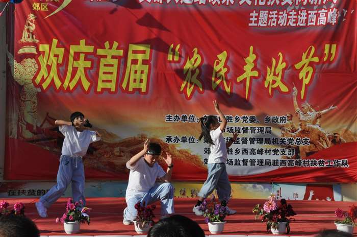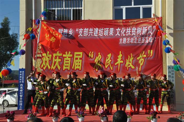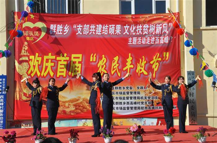 “支部共建结硕果、文化扶贫树新风”, 9月20日,群胜乡庆祝首届农民丰收节主题活动走进西高峰村。此次活动由群胜乡党委、乡政府,区市场监督管理局主办。郊区委组织部、宣传部、扶贫办、区市场监督管理局等单位负责人、群胜乡党政班子成员、郊区市场监督管理局的全体帮扶干部以及各村三职干部共同参加了活动。 “庆丰收”主题活动节目样式新颖,内容丰富,开场舞《丰收的日子》舞姿优美;原创音乐快板《扶贫颂》展现了脱贫攻坚工作取得的累累硕果;扇子舞《祝福祖国》表达了农民百姓喜获丰收迎国庆、祝福祖国的美好心声;各村文艺人演唱的《一个都不能少》、《北国之春》、《妈妈我想你》博得台下观众的阵阵掌声;小朋友们的街舞表演成为整场演出的一道亮丽风景线;而活动中的“乡风文明颁奖”环节更是充分展现了在乡村振兴道路上涌现的一个个典型,脱贫励志户、孝亲敬老模范、卫生文明标兵户、卫生文明示范户,每一位典型人物都是全村人民学习的好榜样。活动在声音嘹亮、气势恢宏的红歌大联唱《歌唱祖国》、《今天是你的生日》中圆满结束。参演此次庆丰收主题活动的表演者既有年过70的村里文化人;又有10几岁朝气蓬勃的祖国花朵;也有驻村工作队的帮扶干部、村两委成员。不同年龄、不同身份,但大家却有同样的心愿:庆丰收、迎国庆,助力乡村振兴发展,共同打赢脱贫攻坚战,为决胜全面建成小康社会,实现伟大中国梦而努力奋斗。