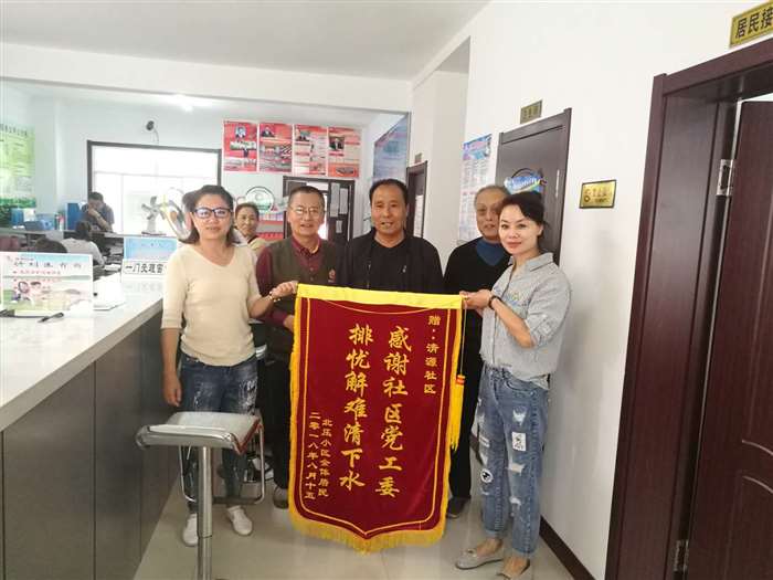 8月15日,居民带着感激的心情为社区送来了锦旗,大家感动地说:“太感谢社区了,如果没有社区的积极努力协调,这堵塞的化粪池和下水井还不知道啥时候才能通呢”。