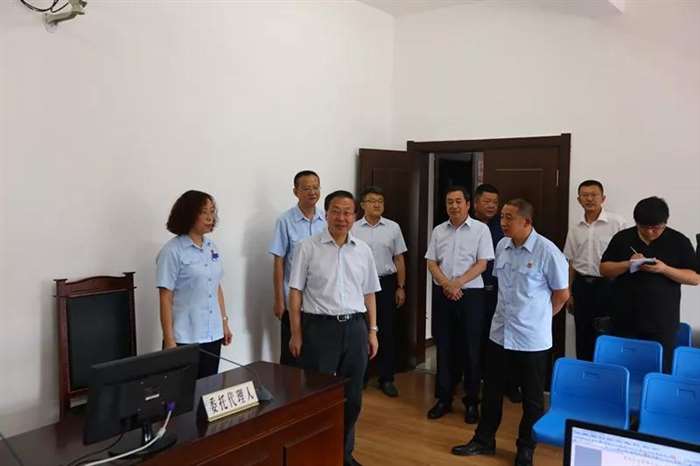 徐建国书记与前来立案的群众亲切交谈,认真听取了群众意见。王斌院长对现场群众的提问一一作了详细解答,赢得了现场群众的热烈掌声。 审判法庭 在数字化法庭,王斌向徐建国介绍了科技法庭的使用情况,审判法庭现在已经开启庭审全程网络直播模式,庭审活动在中国庭审公开网全程同步直播,进一步提高审判过程的透明度,最大限度地接受监督。