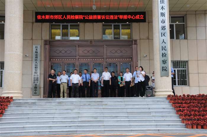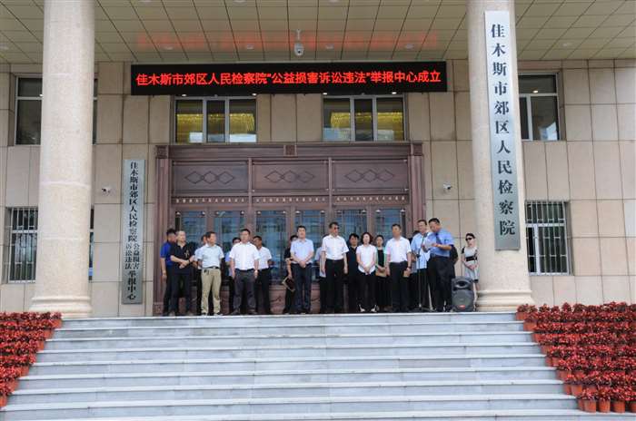 7月18日上午9时30分,佳木斯市郊区人民检察院“公益损害与诉讼违法举报中心”正式揭牌成立。郊区委书记高志军,郊区委常委、纪检委书记、监察委主任王艳波,郊区委常委、副区长孙跃武,郊区人大常委会主任郑昌辉,郊区政协副主席战广生,法院、公安、国土、环保等15家部门领导及部分人民监督员参加揭牌仪式。郊区委书记高志军与郊区人民检察院检察长陈强为“公益损害与诉讼违法举报中心”揭牌。