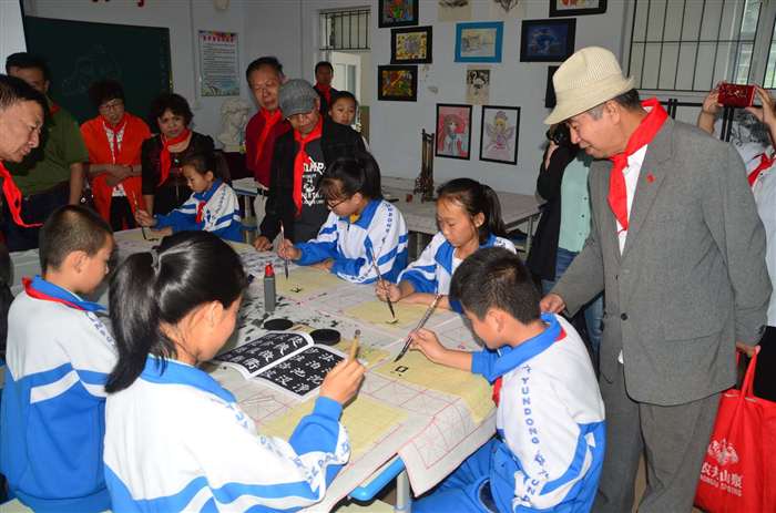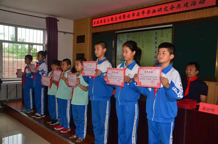 活动中,少先队员为书法家们佩戴了红领巾,颁发了校外辅导员聘书;书法家们参观了学校美术书法师室,为正在习练毛笔字的孩子们耐心讲解书法知识和运笔要领,鼓励孩子们从小热爱祖国,弘扬国学,努力学习,勤奋励志,将来成祖国建设的有用人才;同时,学校颁发了优秀家风家训获奖证书。