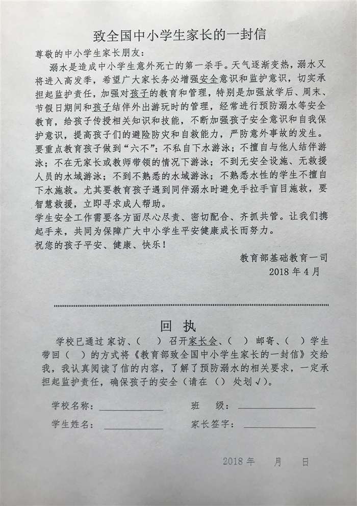 讲座中,老师首先通报了近期发生的小学生溺水身亡事件,分析了事件发生的原因,用一个个鲜活的案例告诉学生防溺水的重要性,并介绍学校近期安全工作的部署落实情况,强调当前防溺水工作的严峻形势,教育师生必须提高警惕,做到安全警钟长鸣,重点做到“六不准”:1、不私自下水游泳;2、不擅自与他人结伴游泳;3、不在无家长或教师带领的情况下游泳;4、不到无安全设施、无救援人员的水域游泳;5、不到不熟悉的水域游泳;6、不熟悉水性的学生不擅自下水施救。
