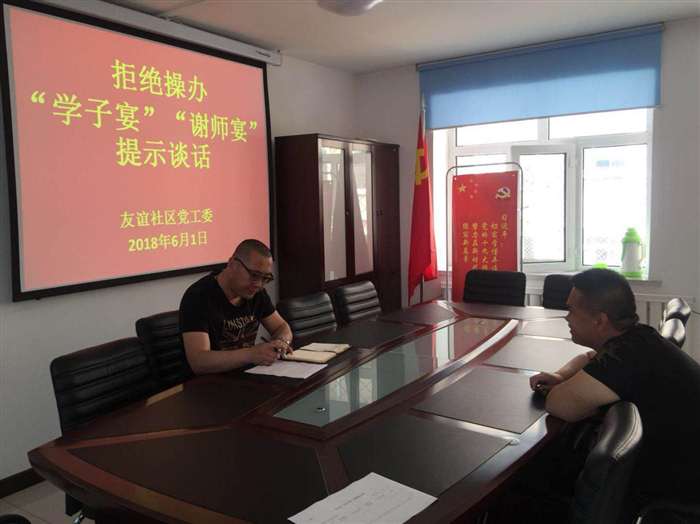 为进一步贯彻落实中央八项规定精神,严禁党员干部和公职人员借子女升学之机违规操办“学子宴”,近日,友谊社区党工委针对有子女升学的党员干部召开“升学宴”、“谢师宴”廉政提醒谈话会,对可能出现的问题早告诫、早提醒、早纠正,践行了“四种形态”第一种的提醒谈话。并与党员干部签订了不操办“升学宴”“谢师宴”的承诺书,让党员干部做出廉洁承诺,落实主体责任。下一步,友谊社区还将利用QQ、微信平台推送廉政信息,正面引导党员干部不要操办、参与“升学宴”、“谢师宴”。同时,社区LED显示屏将向社会公开监督举报电话,畅通举报渠道,随时接受群众的监督。