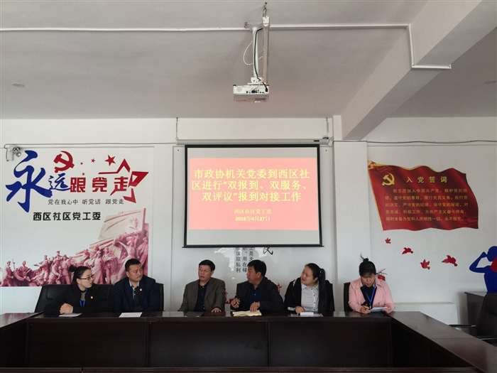 4月27日下午,市政协秘书长、机关党委书记周亚带领相关工作人员到西区社区进行“双报到、双服务、双评议”报到对接工作。
