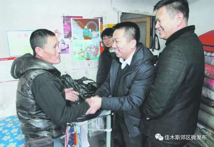 11月23日下午,佳木斯移动公司联合郊区红十字会、郊区区委办来到四丰乡董家村开展寒冬送温暖慰问活动。佳木斯移动公司共为全村4户特困家庭送去了1600元慰问金及部分过冬衣物,让特困家庭感受到来自社会的关爱和温暖。图为特困户黄志华(左一)紧紧握着佳木斯移动公司副总经理王建军的手,表示感谢。