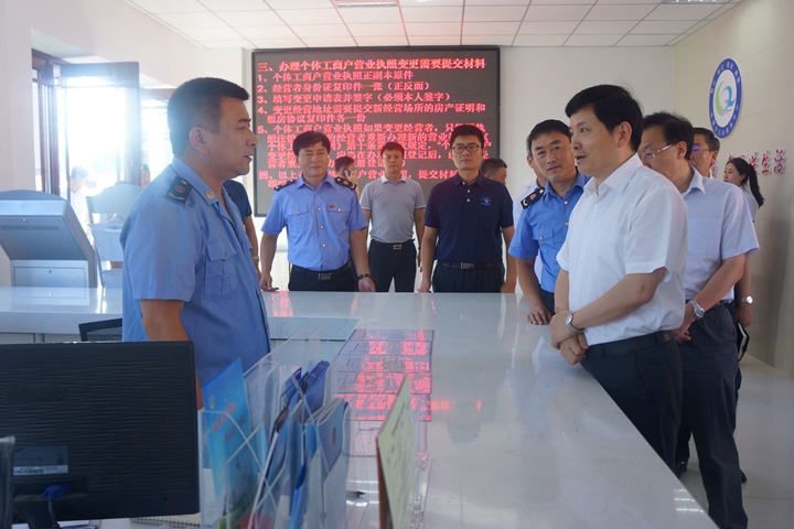 督查组一行来到郊区长青乡综合服务中心,详细询问了解我区在商事制度改革、简政放权、优化公共服务流程、厘清权责完善“一单两库一细责”、推进“互联网”+“政务服务”等工作的落实情况,并在个体工商注册登记等窗口深入了解了在落实“放管服”改革实践中采取的具体措施和实施效果。