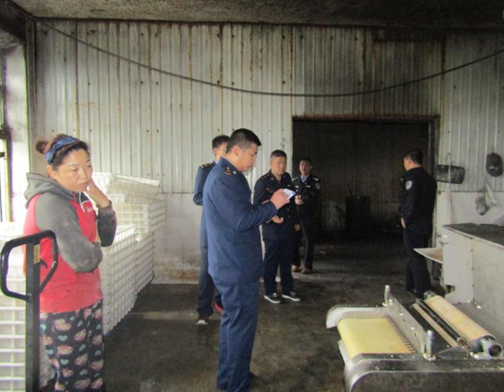 为严厉打击危害人民群众生命健康的违法生产经营活动,切实净化食品市场环境,维护老百姓的餐桌安全,郊区深入开展打击制售假冒伪劣食品专项整治行动,各执法部门加大力度,统一行动,联合执法,确保打击常态化,对违法违规食品生产企业产生强大的威慑作用。2017年6月2日至7日,经过工作人员几天的蹲坑守后、明察暗访,掌握确切线索后,由郊区政法委牵头,会同区市场监督管理局、区公安分局、区文广新局等单位,共派出执法人员20人、行政执法车辆4台,对辖区不法黑加工点进行取缔的联合执法行动。 在联合执法行动中,一举取缔了位于长青乡前进村加工豆腐泡的豆制品厂、前进村加工酸菜制品的“黑”加工点和位于西区社区动迁区内的生产加工实蛋的鹏博食品加工厂,对三家存在严重食品安全隐患的“黑”加工点进行了依法取缔。 长青乡前进村豆制品厂、酸菜制品厂加工点均属无证无照经营,西区社区鹏博食品加工厂有照无证,执法人员进入加工点进行现场检查时,这三处地点空气中弥漫着令人作呕的味道,环境十分恶劣,生产条件不符合食品生产加工要求。对此,市场监督管理局依据《中华人民共和国食品安全法》的有关规定,执法人员当即依法查封了三处黑加工窝点,并对黑加工点的生产加工工具及生产加工所用原材料打浆机1台、豆油分离器1台、豆泡切割机1台、电机2台、原料油3桶(约120斤)、黄豆41袋(约4100斤)、食用氯化镁2袋进行封存,依法查扣全部涉案物品货值约10万元,铲除了三处严重威胁群众餐桌安全、危害群众身心健康的黑作坊,对各类制售假冒伪劣食品企业和商户产生了震慑作用。