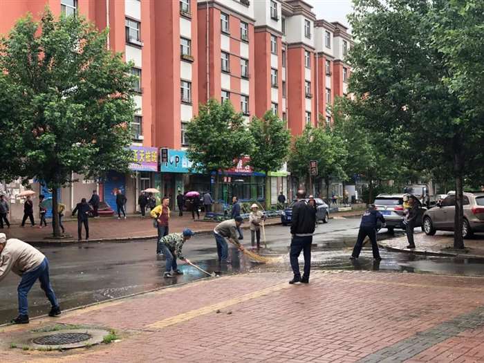 在大家的共同努力下,集中将辖区积水清理完毕,大家在清理积水过程中深受居民一致好评。在清水过程中,商户、企业也自发的加入到清队伍中,各自把自己门前的人行道的积水清理干净。