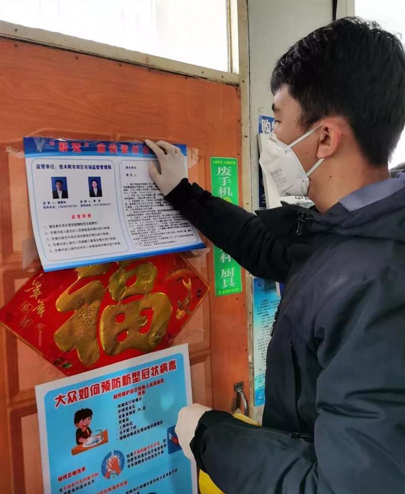2月12日,沿江镇党委、政府联合郊区市场监督管理局沿江市场监督管理所、沿江派出所共同对全镇下辖各村50余家超市展开疫情防控工作。要求各超市醒目位置悬挂或者摆放营业执照和食品经营许可,并张贴新冠防控责任公示板。要求超市业主敦促进店消费者佩戴口罩并进行登记。同时向村民发放84消毒片并讲解使用方式及使用频率,让群众远离病毒,保护生命安全。