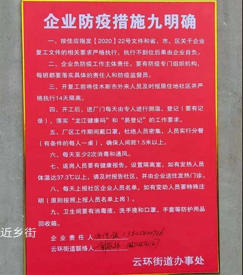 按照中央、省市区委关于疫情防控和复工复产两手抓、两不误的要求,云环街道办为复工企业制定了《企业防疫措施九明确》。成立企业督导小组,以复工企业为重点,对企业复工情况及复工后防控措施落实情况进行监督检查。现场走访了6家企业,详细了解了企业门岗防疫关卡设置、流动人员体温监测和公共场所消毒通风等情况,对发现的问题及时向企业进行了反馈,并适时开展“回头看”,确保问题整改落实到位。