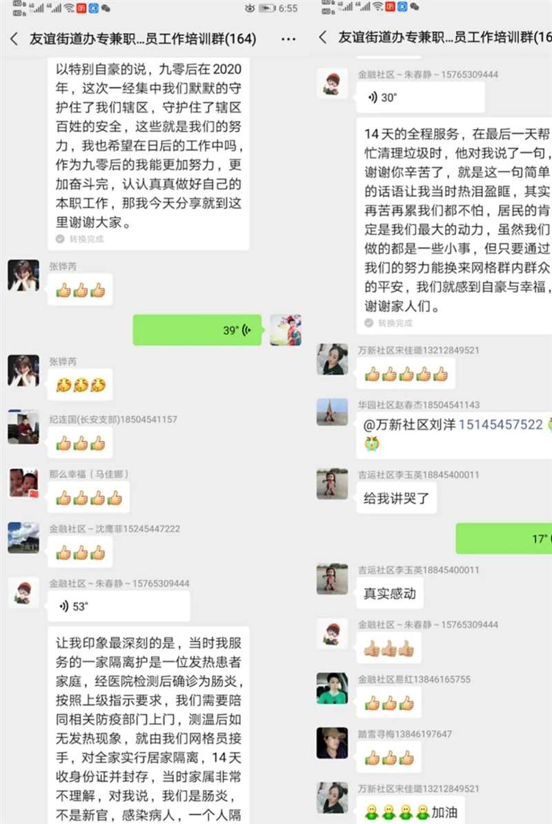 培训期间,新、老网格员代表讲述的在工作中遇到的难题和最终破解问题的经验让大家受益匪浅,亲身经历的与居民之间的暖心事也引起了大家共鸣。这场特殊的培训课受到了大家的热烈欢迎,持续了两个小时,课程结束后微信群中进行了深刻的讨论。网格员们对街道办网格指挥协调中心所组织的创新形式的培训十分认同,纷纷表示通过此次培训,不仅传递了温暖和感动,更学到了很多实用的工作技巧和经验,同时也进一步增强了社区工作者的职业荣誉感。