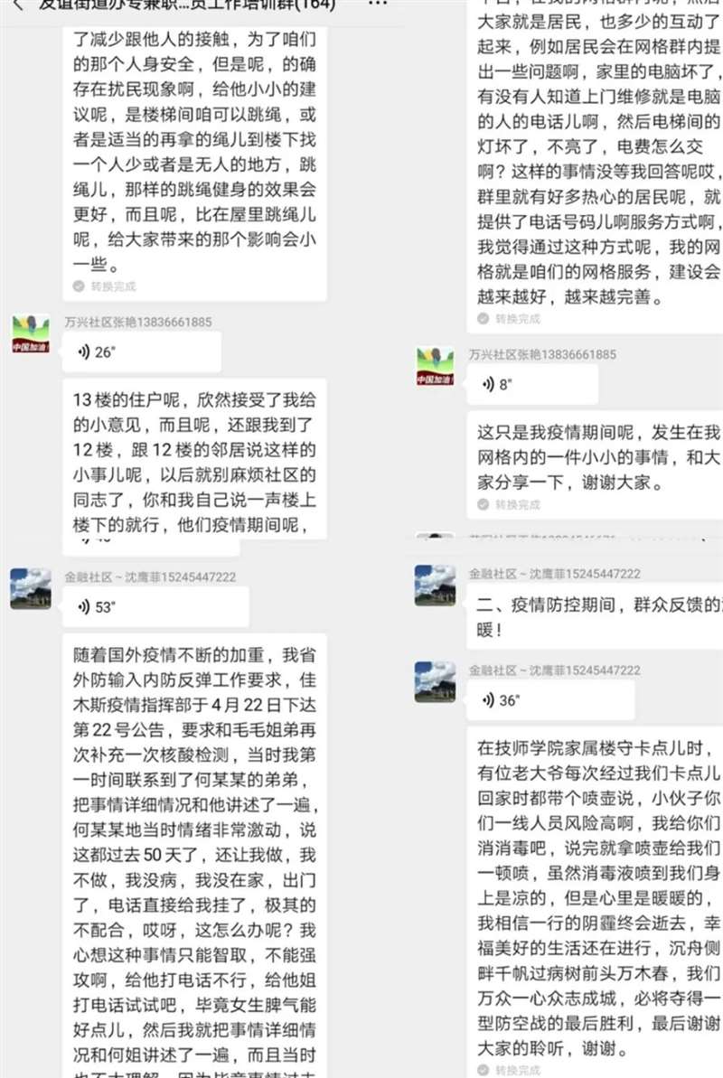 5月2日晚8时,街道办第三次微课程正式开始。经过了第一期的便民综合业务知识微视频课程培训和第二期的社区居民网格信息采集专题语音培训课程后,专、兼职网格员们对街道办设置的特色课程更加期盼,培训还未开始,群内气氛就异常热烈。第三次培训课程更加吸引大家的眼球,是由街道办网格协调指挥中心组织8个社区的新、老专职网格员代表线上分享各自在社区网格工作中遇到的困难、问题和解决的办法、经验,以及在防疫期间遇到的暖心事。