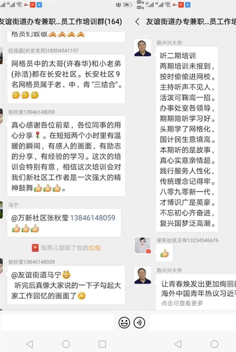 全市网格工作化建设工作开展以来,郊区友谊街道办积极探索创新,开展各种微视频、微分享的特色培训课程,在疫情期间通过建立的专兼职网格员工作群进行了3次线上培训,收到了良好效果。