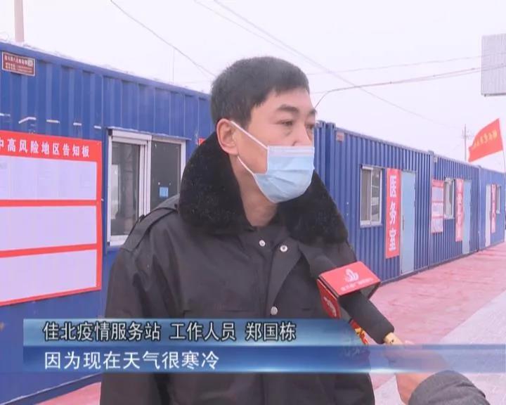 佳北疫情服务站工作人员 郑国栋:“排查人员是由佳木斯郊区几个乡镇的机关干部组成,还有咱们佳木斯市交警支队,还有驻乡镇的卫生院及市传染病院的工作人员,排查人员半小时一个班,因为现在天气很寒冷,半个小时就去换班,二十四小时全员在岗,一共排查人员22人,3人一组分成7个班。”