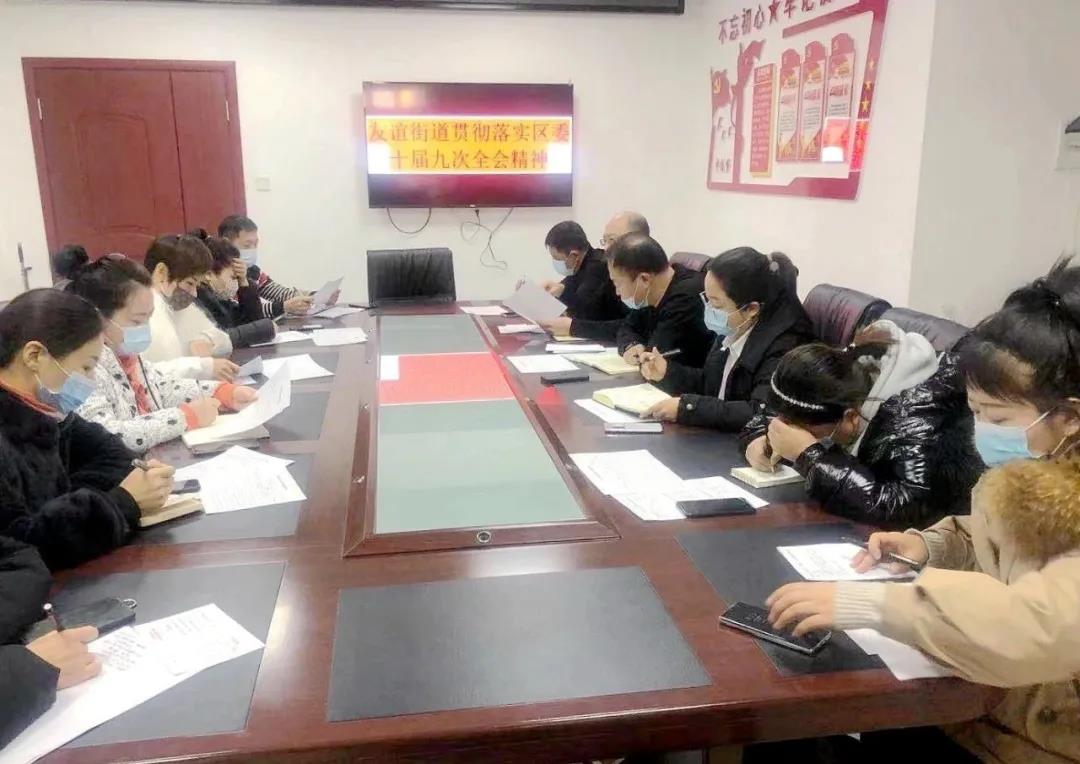 为深入学习贯彻区委十届九次全会精神,营造学习全会精神的浓厚氛围,推动区委全会精神落地生根。友谊街道领导班子、党员干部、8个社区主任召开专项学习会议。
