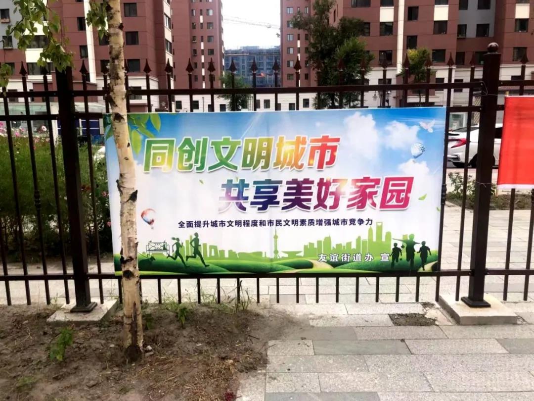 友谊街道在辖区内悬挂各种文明创城板块、粘贴“佳木斯文明行为七字谣”、营造创城的氛围,并与居民进行面对面交流,使广大市民了解并知晓创建文明城市和获得文明城市荣誉的重要意义。