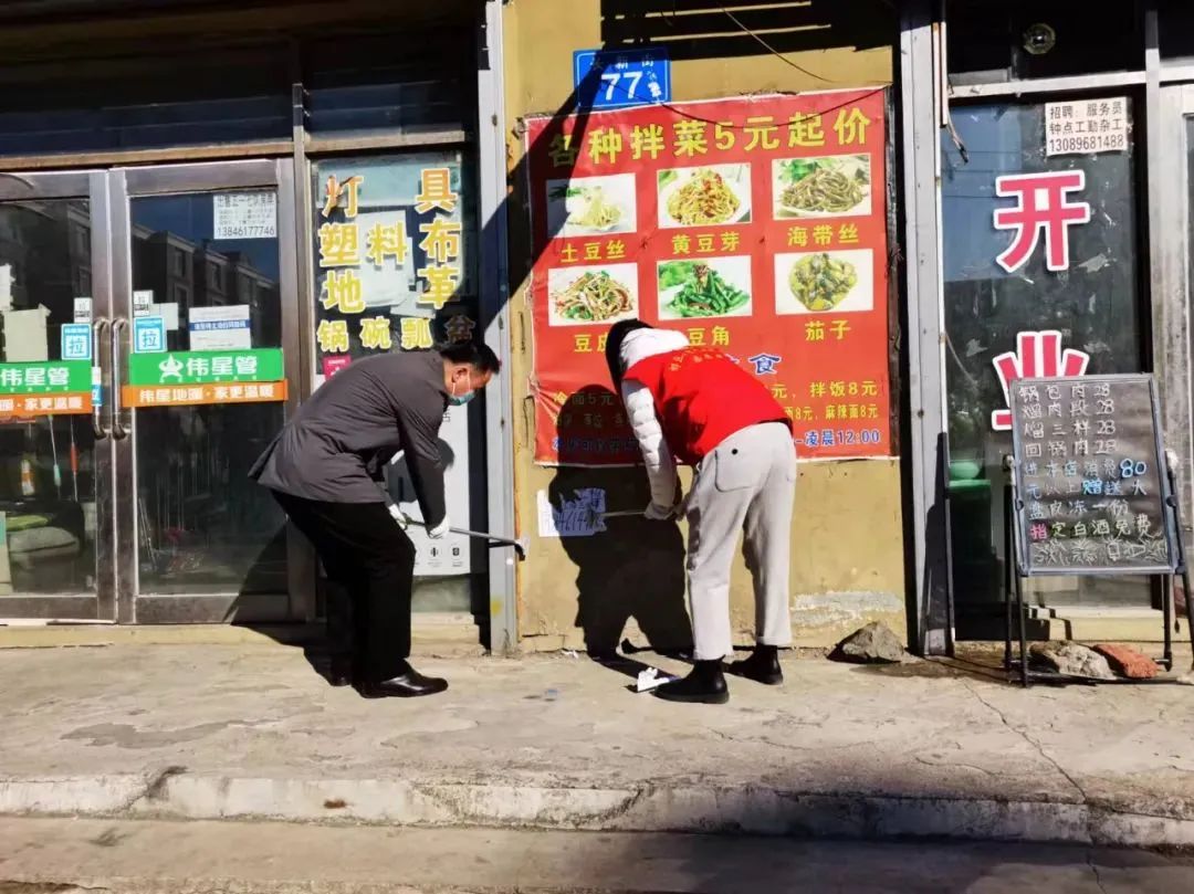 在清理现场,社区工作人员及党员干部不怕脏不怕累,拿着小铲、水瓶、垃圾袋等工具,对楼道门、楼道内的墙体及楼梯扶手上的小广告进行了彻底清理。