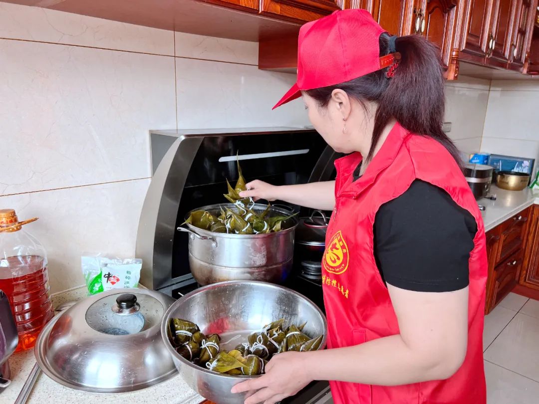志愿者们准备了粽叶,蜜枣,糯米等食材,在“包粽能手”阿姨们的指导下几名年轻志愿者紧张忙碌着,边包粽子边交流经验,动作从生疏到娴熟,粽叶在他们手中弯曲折叠,填米放枣、裹叶子扎线绳,一个个独具风格的粽子就呈现在大家的眼前了,再经过几个小时的慢火熬煮,近200只粽子新鲜出炉,缕缕粽香营造出浓浓的端午节氛围。