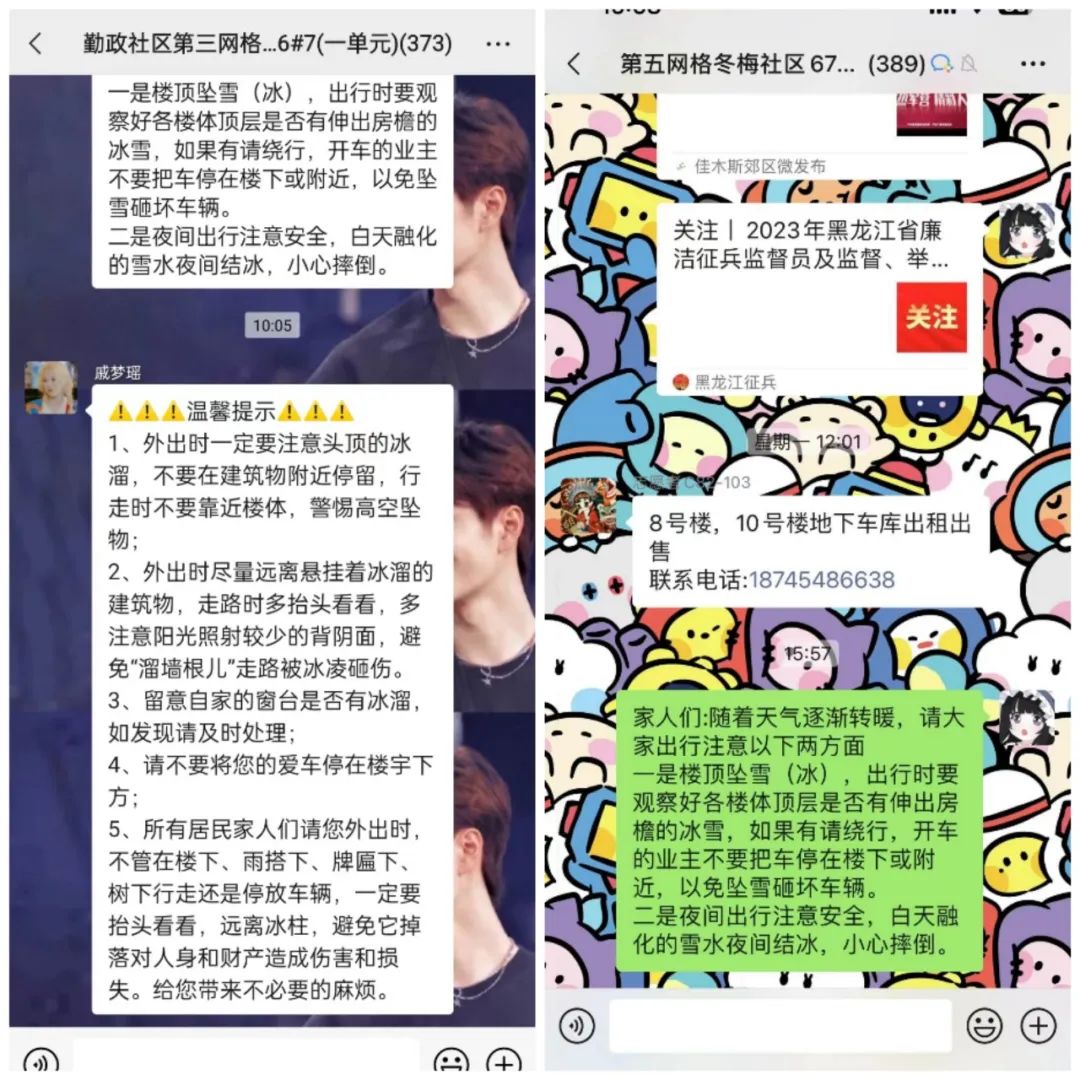 各社区网格员在居民网格群中发送安全提醒;在单元门、楼梯间、居民楼侧等显著位置张贴温馨提示,提醒居民远离房檐行走,防止高空坠物;车辆尽量停放在空场处。