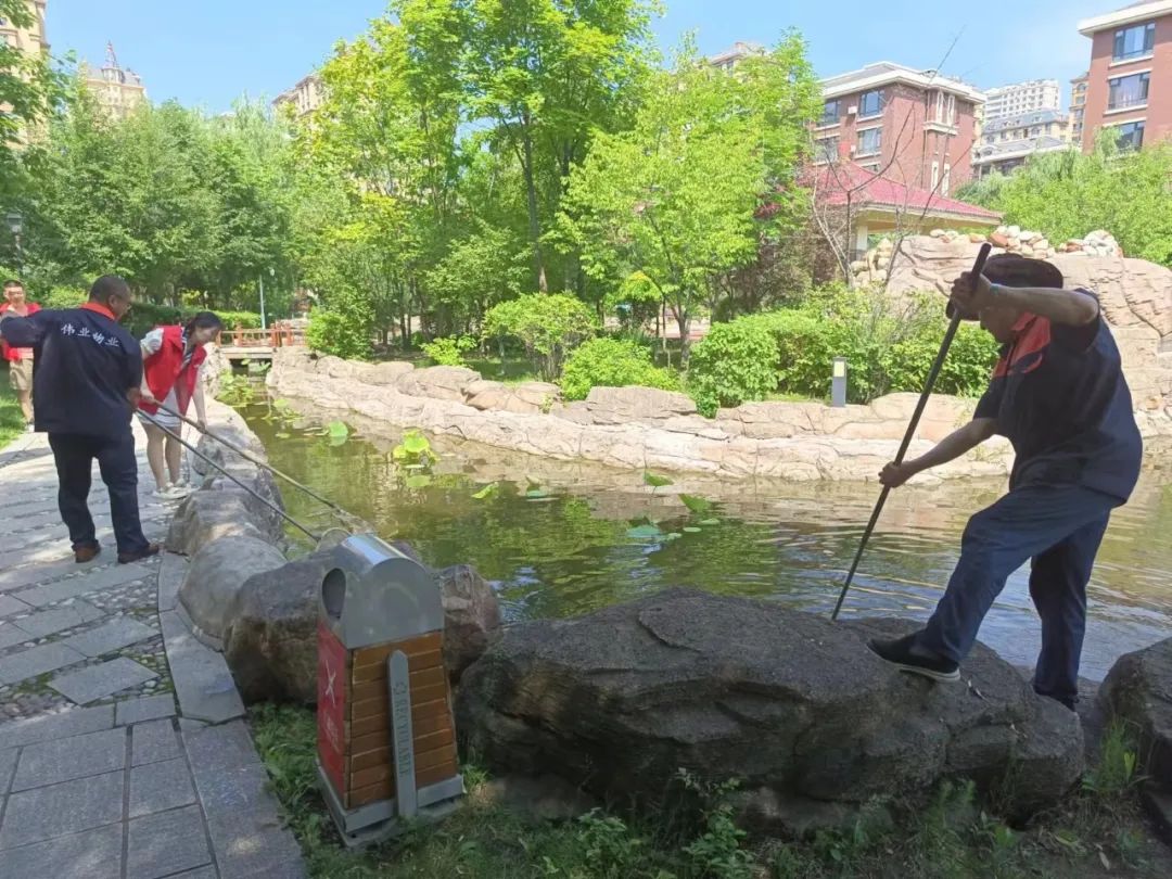 随着夏季到来,气温升高,人工湖内的水草进入迅速生长阶段,严重影响小区内人工湖水质。近日,红旗街道冬梅社区新时代文明实践站组织社区党员、志愿者、辖区物业对蓝爵小区人工湖开展清理整治工作,为居民营造干净整洁的宜居环境。