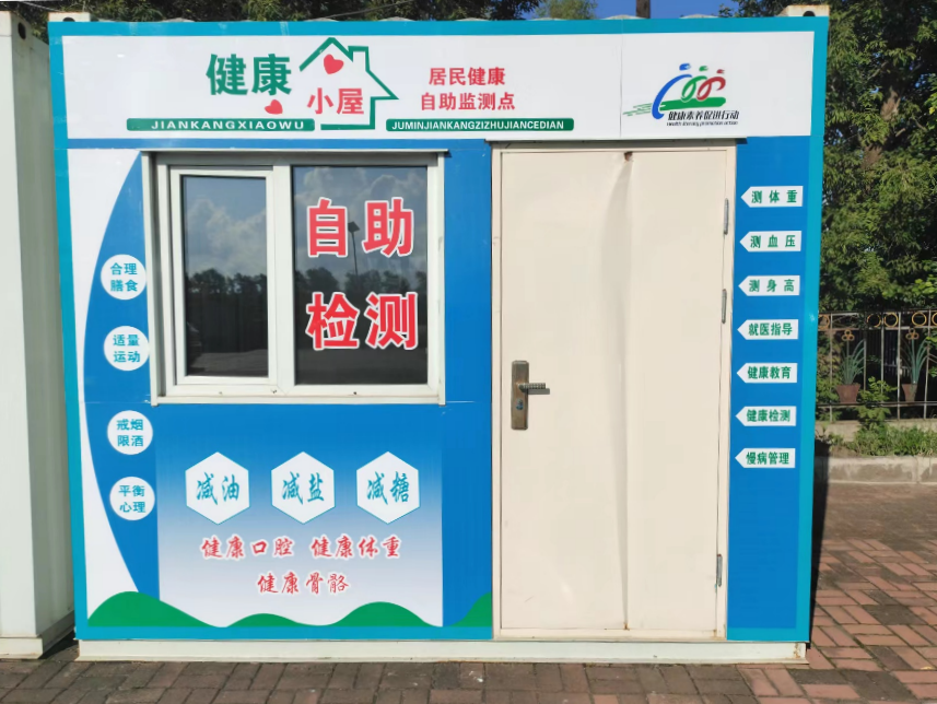 “健康小屋”内配备有身高体重秤、腰围尺、血压计、血糖仪等简便实用的测量工具和设备。各种测量设备配有使用说明图解、注意事项及检测结果的正常值参考范围,以及基础的健康指导及建议。居民可随时进行健康监测,必要时有专业医生给予个性化指导。“健康小屋”还配备饮水机等便民设施,供来院看病就医群众及过路司机、辖区环卫工人等免费使用。