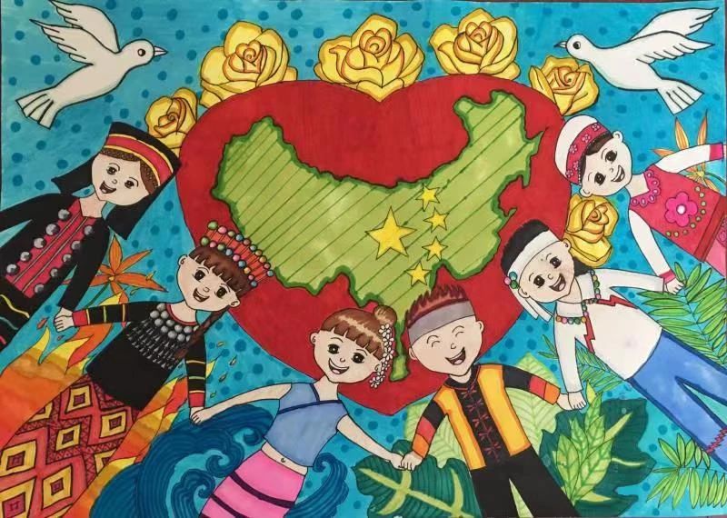 学生们用手中的画笔,描绘出一幅幅风格迥异的作品,展示出对伟大祖国的热爱之情,充分表达出坚定维护民族团结的心声。